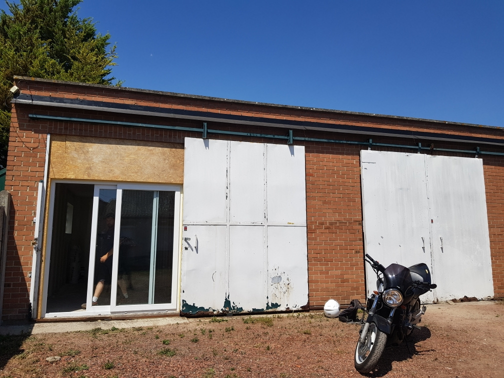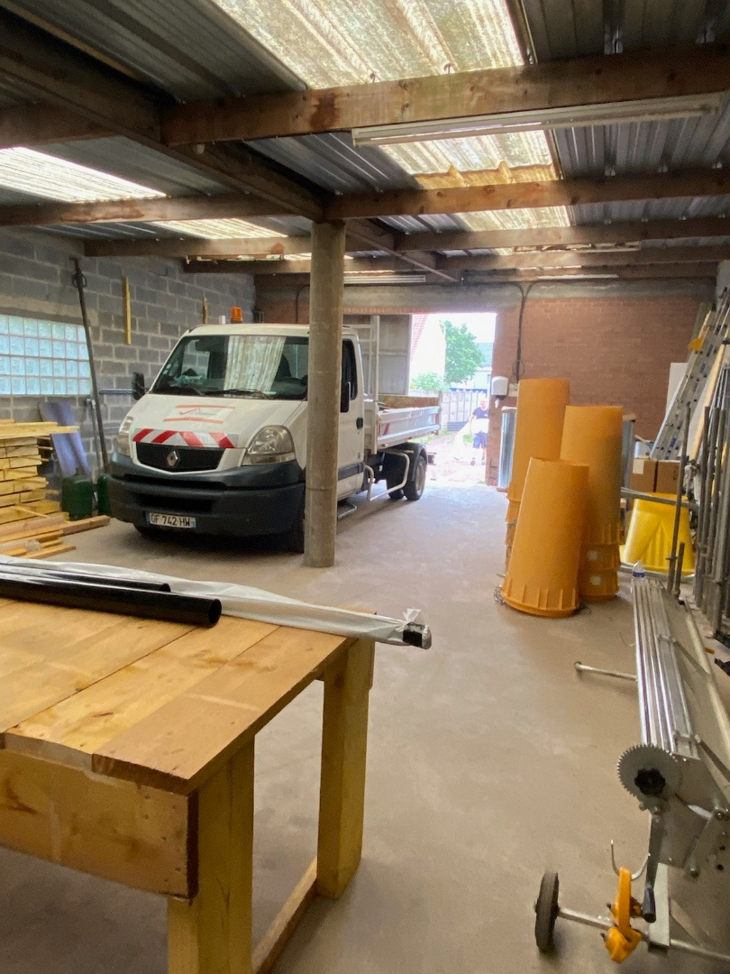 Hangar spacieux de 150 m² au sol, accompagné d'un bureau et d'un parking privé pouvant accueillir jusqu'à 3 véhicules.
