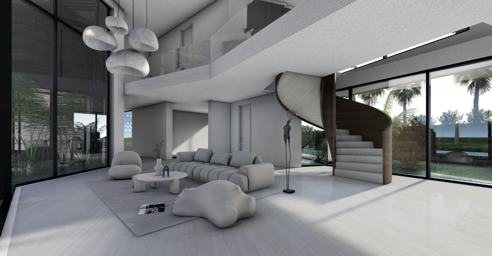 Le séjour, spacieux et ouvert sur une cuisine moderne, donne accès à une grande terrasse et à une piscine.